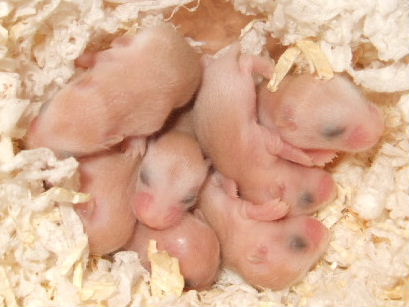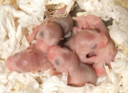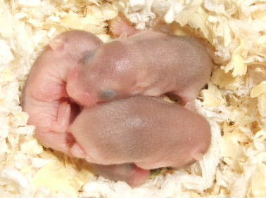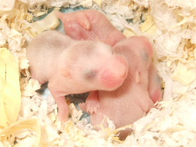 生後4日目頃まで全身色付かず、5〜6日目で頭部と背中に茶色の色が出、それ以外は白い毛が生えて来る。画像は生後6日目。 |