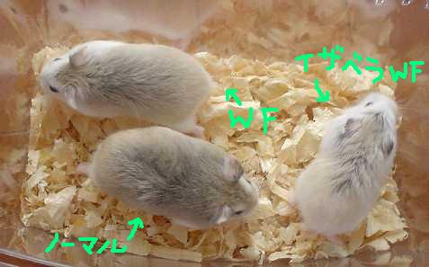 初期ペアが共に2歳半近くまで生きたので、WF=短命では無いと思われる。恐らくWFを増やす為、近親交配の繰り返しや問題の有る遺伝子が排除されて来なかった結果、遺伝性内耳障害を持つ個体がかなりの割合で居る。くるくる回る・斜頚などの症状の出たラインは、今後繁殖をしないような配慮を。 |