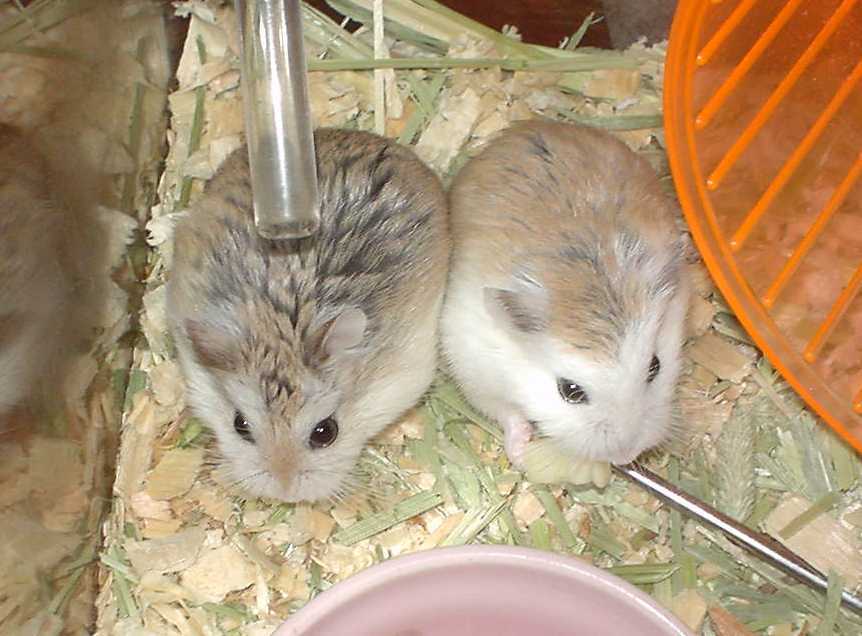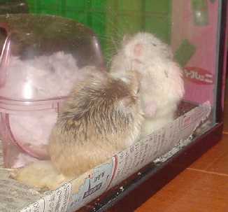 ゴールデンやジャンガリアンでは、繁殖する時だけ数時間お見合いさせて、それ以外は別居させるのが基本のようです。でもロボの場合、繁殖を狙うならペアで同居をさせてしまうのが一番簡単です。 というのも、ロボの発情は非常に判りにくいから^^;ゴールデンのようにメスが尻尾立てて固まってしまうという事も無いし、発情時間が短く、運良く交尾が確認できてもジャンガリアンのようにオスが放心しないのでちゃんと交配できたかどうかの確認が難しいです。 なので、オスのケージ(または新しく用意したケージ)にメスを入れて、喧嘩しないようならそのままメスの妊娠が確認できるまで同居させます。最初はメスが鳴いて逃げ、オスが激しく追い掛けますが、噛み合いの喧嘩をしないならそのまま数時間様子を見ます(噛み合いになるようならすぐ分ける)。数時間たって、2匹が巣箱に入って寝てたり寄り添ってたら同居OK(^^)。2匹が離れたところで寝てたり、いつまでたっても緊張してるようなら分けて、数日後にまたお見合いのやり直しです(相手を変えてみたりも)。 |
