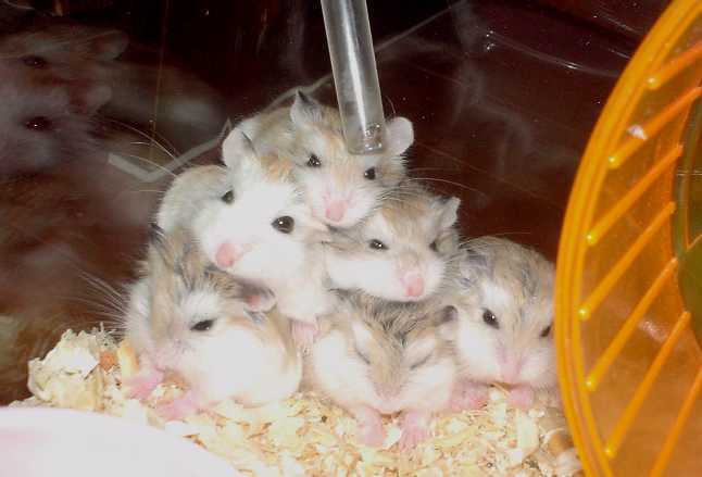 飼育書では「繁殖は比較的難しい」と書かれたりするロボロフスキー。でも自分的にはそう難しくないと思ってます。むしろ私にはジャンガリアンの方が難関(-_-;)。ロボの方は何回か繁殖に成功し、それなりに経験と記録がありますので、これからロボを繁殖してみたいとか、いきなり生まれちゃってたドウシヨウな方の為に少しでも手助けになれば、と繁殖例の記録を残しておくことにしました。 かなり自己流や一般にはお薦めで無い事も書いてあるかと思うので、正しい繁殖の知識は書籍等で付けた上で、あくまでも参考程度に、でお願いします。 |