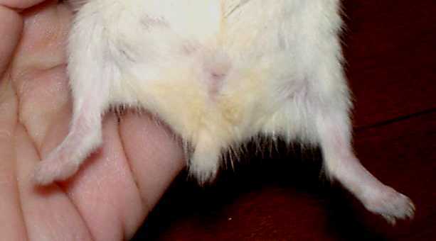 生後1ケ月くらいの幼いときは見分けが付きにくい時も有りますが、繁殖適齢期の生後3ヶ月頃になるとはっきり見分けが付くようになります。オスは生殖器と肛門(↑ウンチ出てる所^^;)の距離があり、メスはほとんどくっついて見えます。オスは成熟するとタマタマ(睾丸)が大きくなるので、横から見ただけでも形でわかるようになりますし(^^)。メスには毛に隠れて診づらいですが、ちゃんと下腹部の両側におっぱいが付いてます。 |